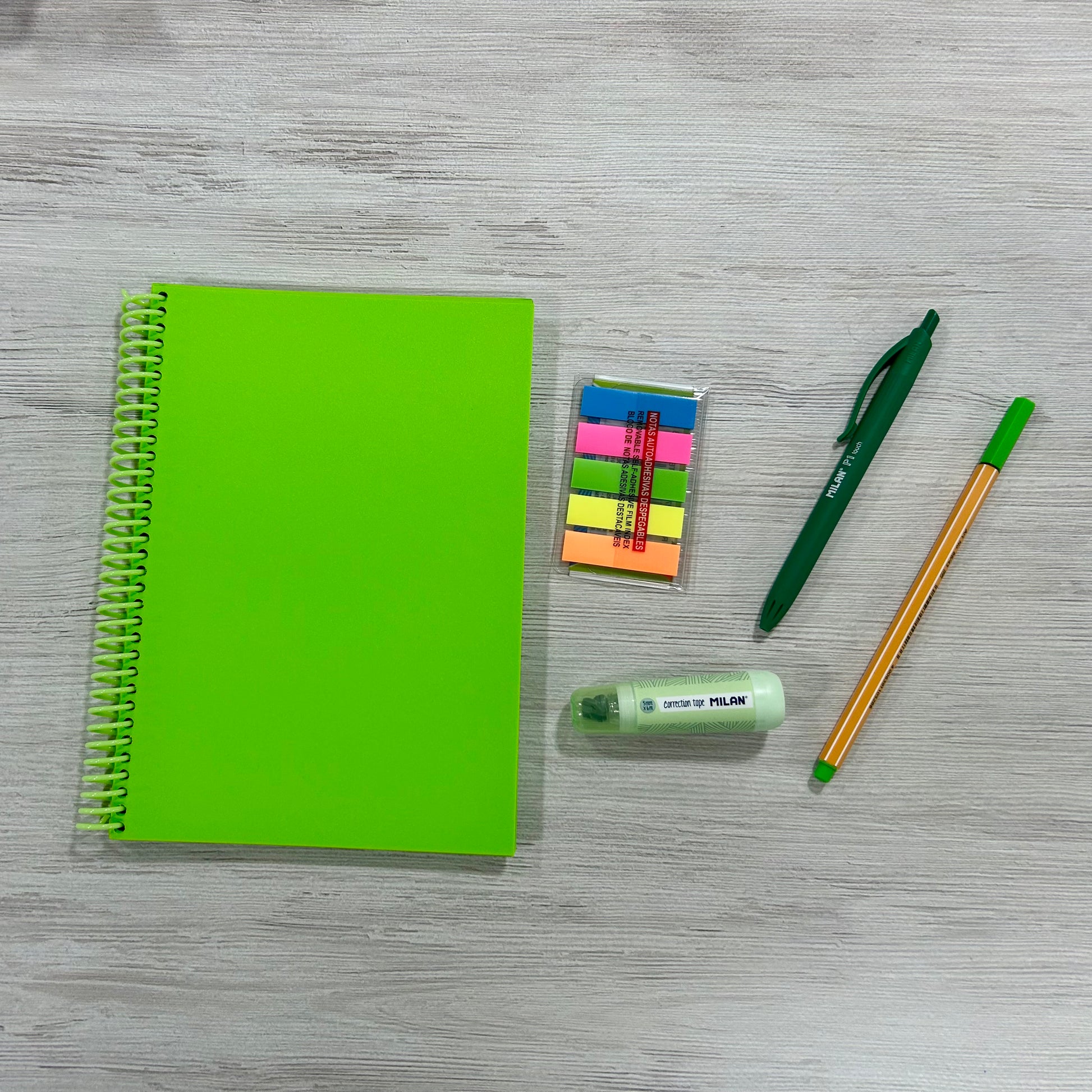 🌿 Todo lo que necesitas para estudiar con flow y frescura: cuaderno, boli, tipex, rotulador y marcapáginas, todo en tonos verdes que combinan con tu mejor mood. Perfecto para apuntes bonitos y vibes tranquilas.