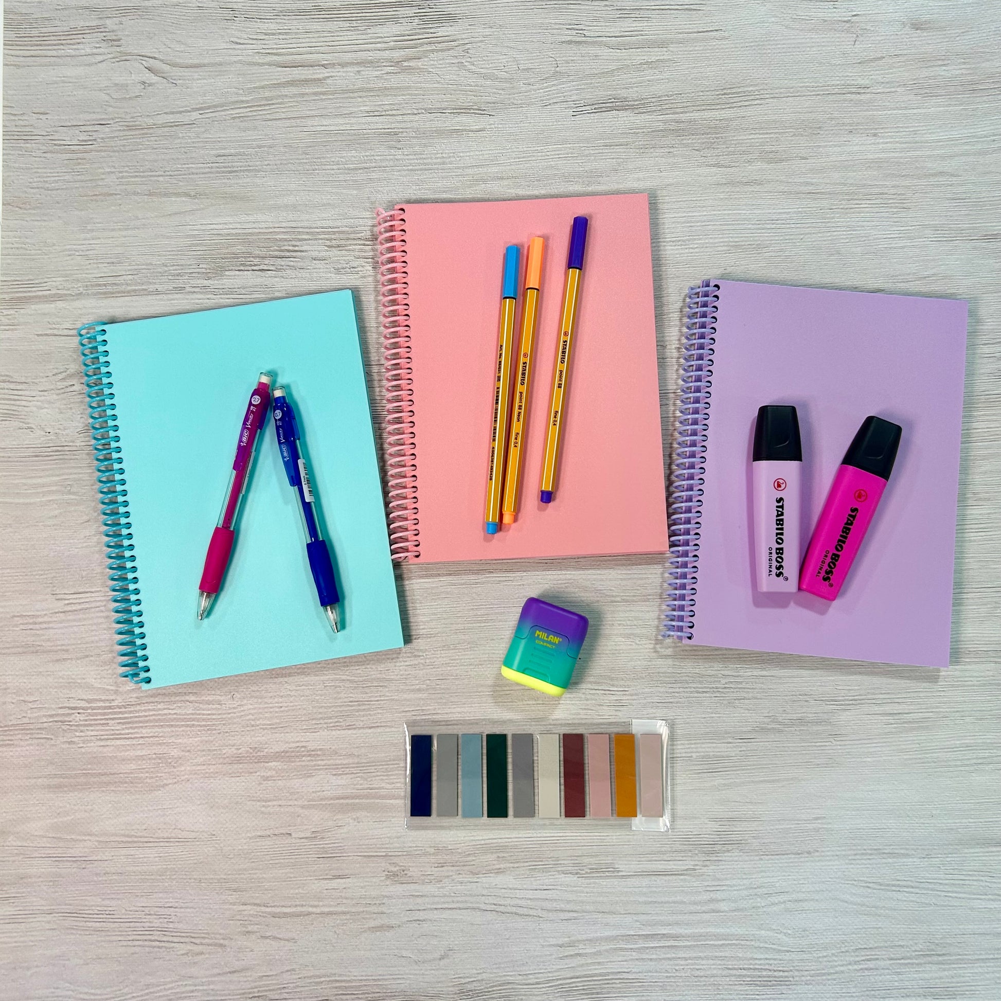 🎨 Tres cuadernos pastel, subrayadores, rotus neón, portaminas molones y hasta sacapuntas con rollo: este pack lo tiene todo para petarlo en clase o en tu Bullet Journal. Si te flipa la papelería colorida y útil, este es tu kit definitivo.